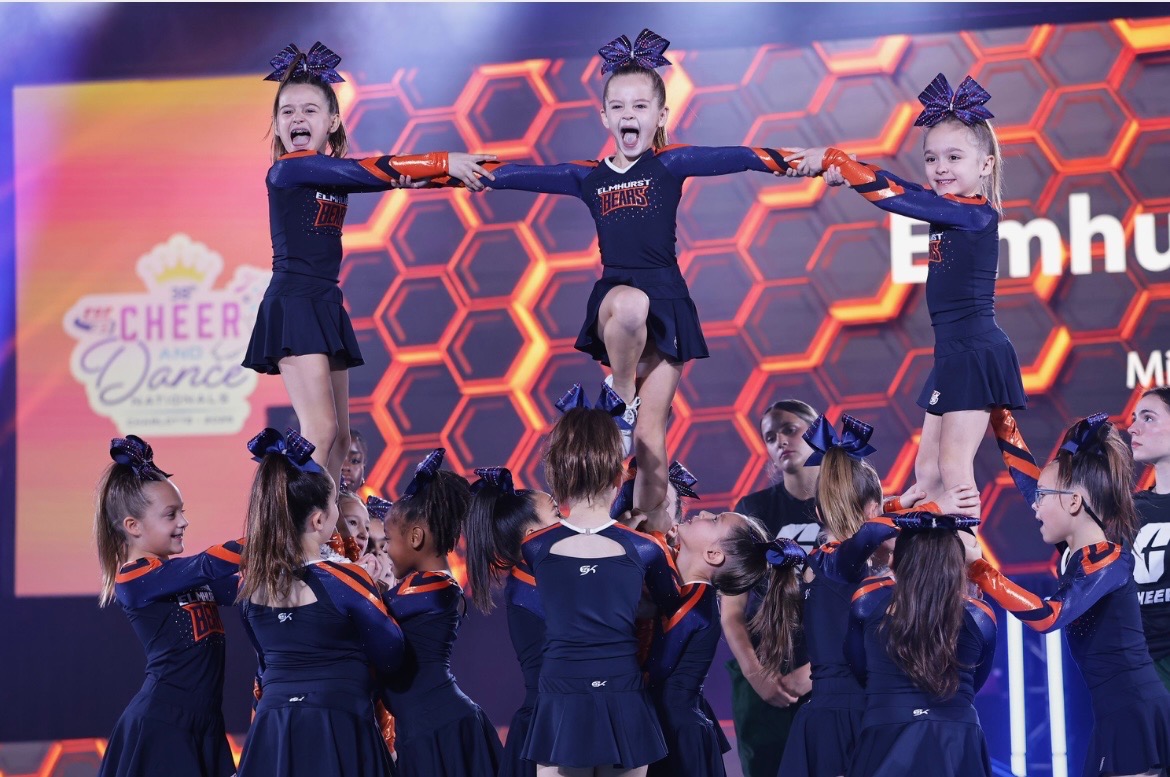 Elmhurst Bears cheer program offers programs for 4 – 13 years of age. Competition teams start at age 6, and the opportunity to compete nationally in Pop Warner’s National Cheer and Dance Competition in Charlotte, NC begins at age 8. The four Elmhurst Bears competition cheerleaders placed 1st, 1st, 2nd, and 3rd at Nationals in 2025!